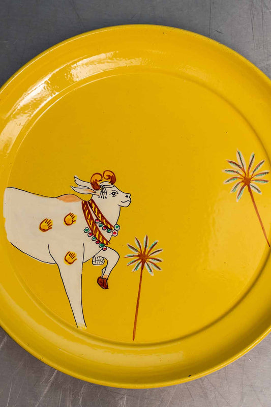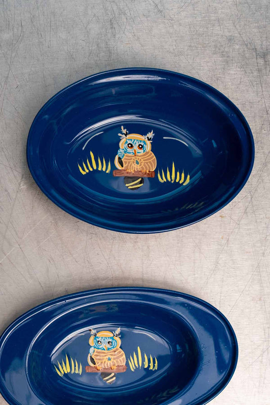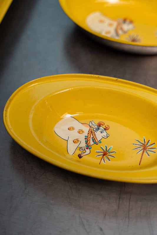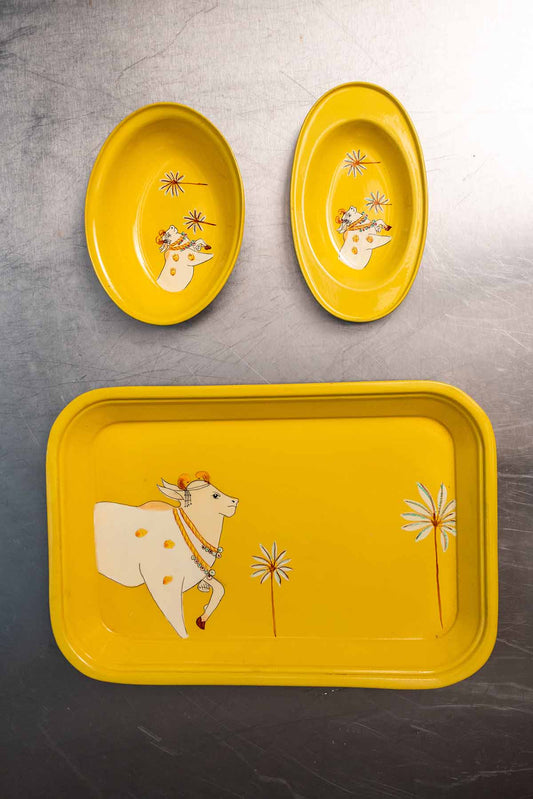Colección de bandejas, platos y cuencos de acero pintados a mano.