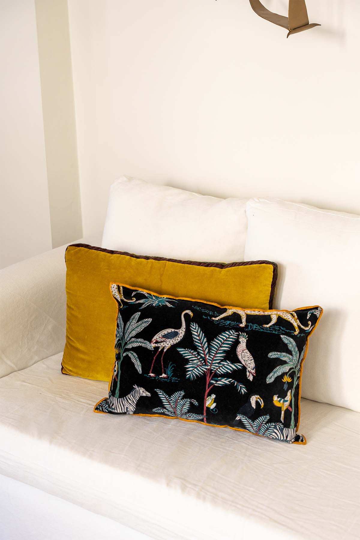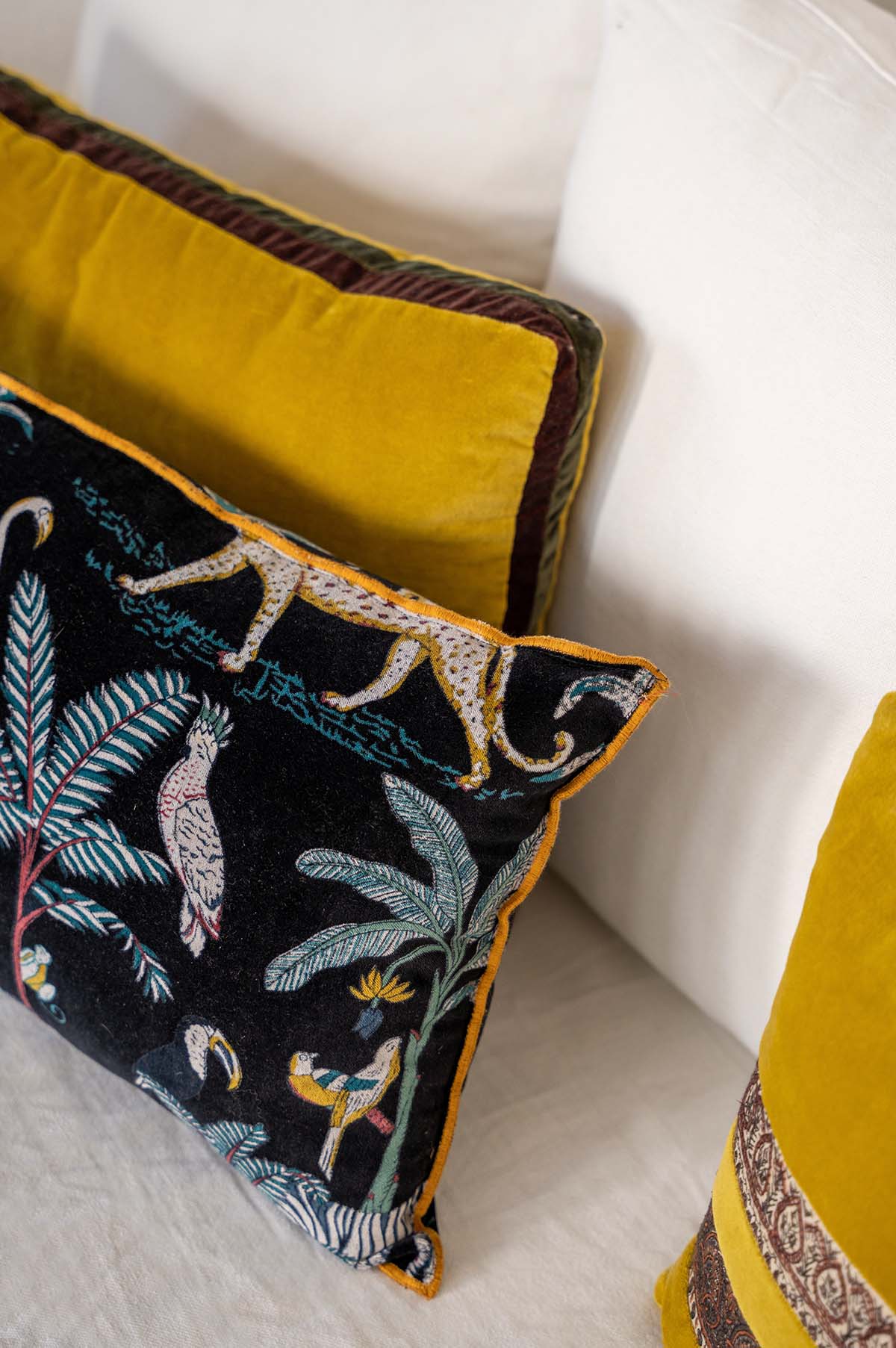 Almohadón terciopelo de algodón con ribete en mostaza. Cierre con cremallera. Ambos lados con el mismo estampado.