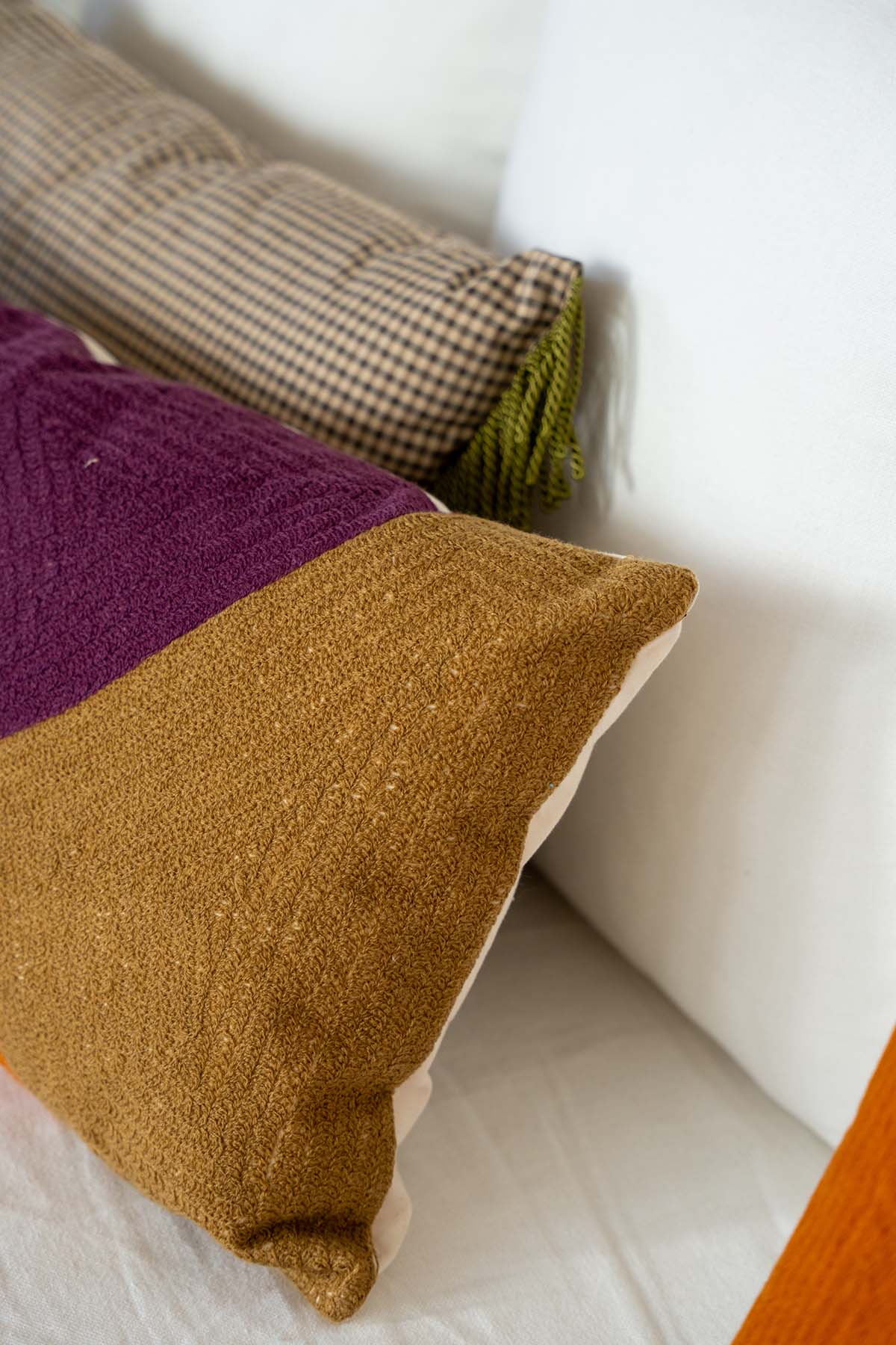 Almohadón algodón de cuadros y flecos laterales verde musgo. Cierre con cremallera. Ambos lados con el mismo estampado.