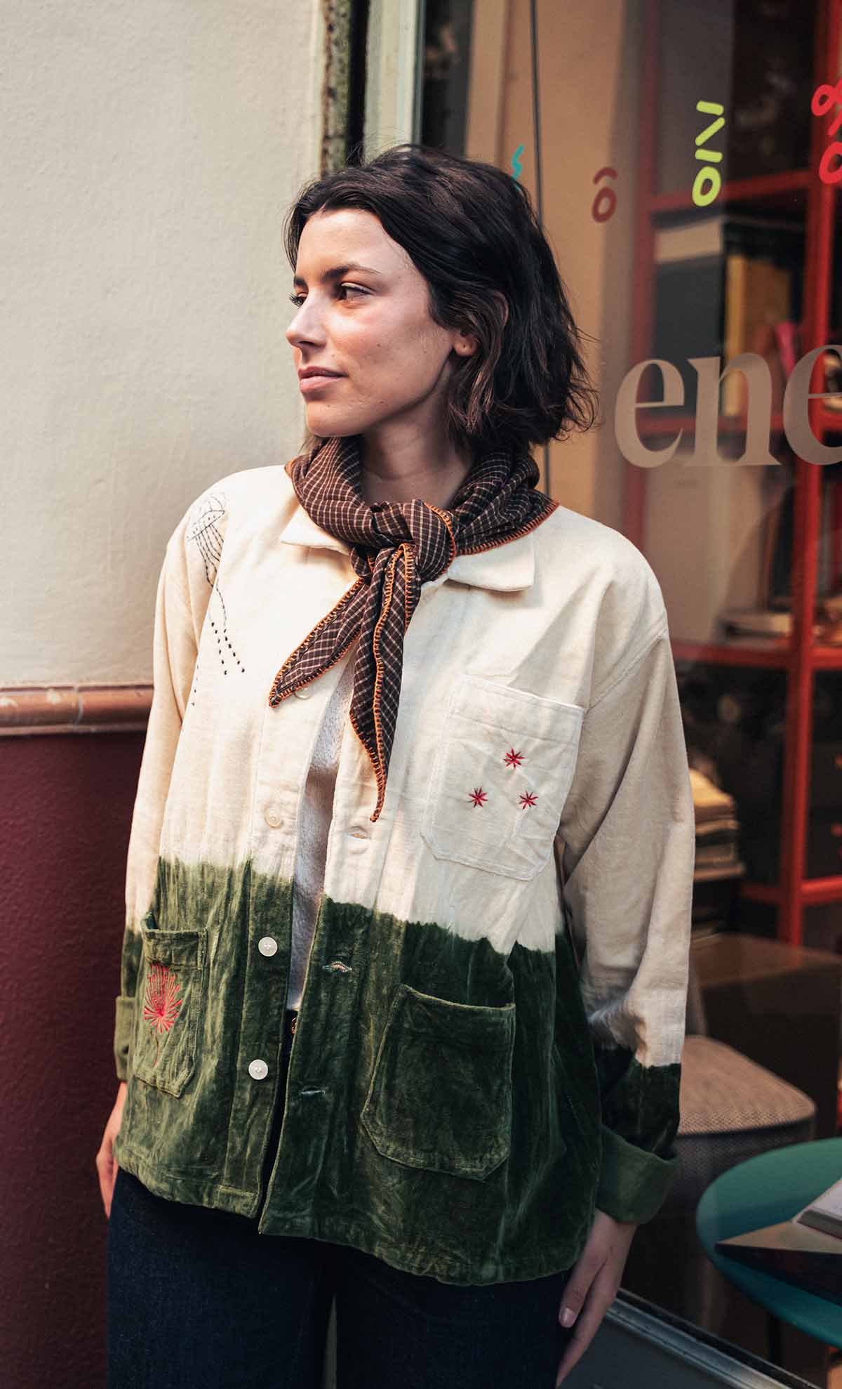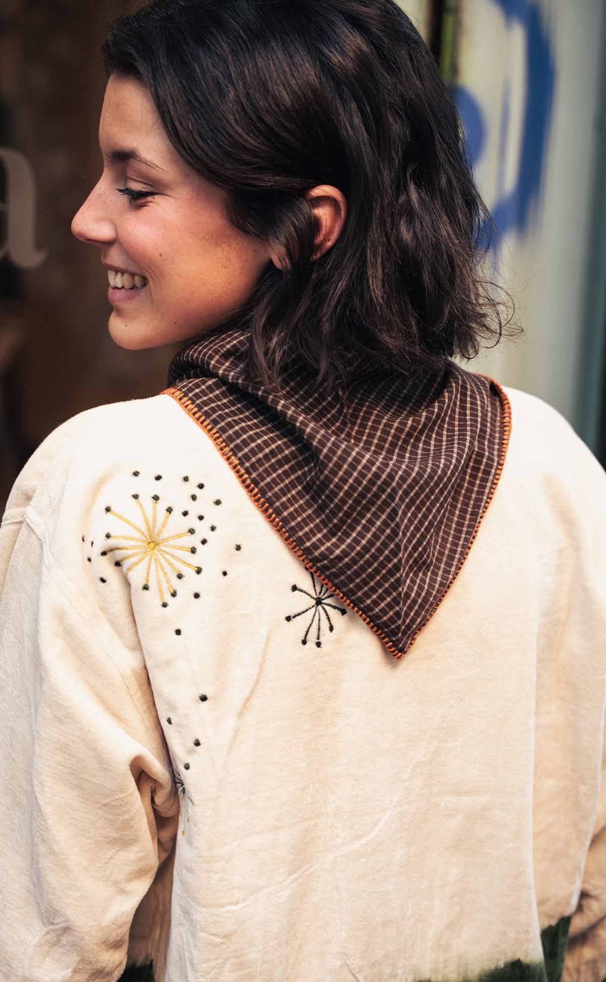Pañuelo en algodón block print. Detalle de bordados a mano.