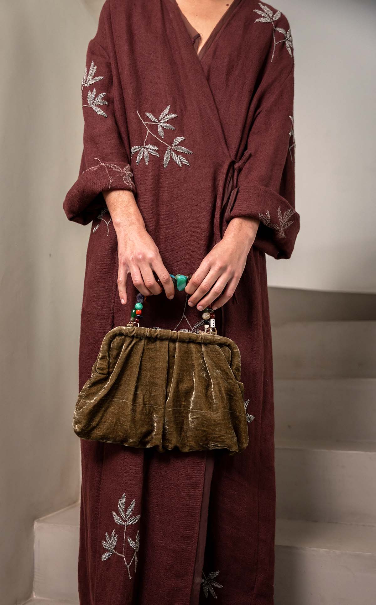 Bolso de terciopelo de seda con asa de piedras e interior de algodón.