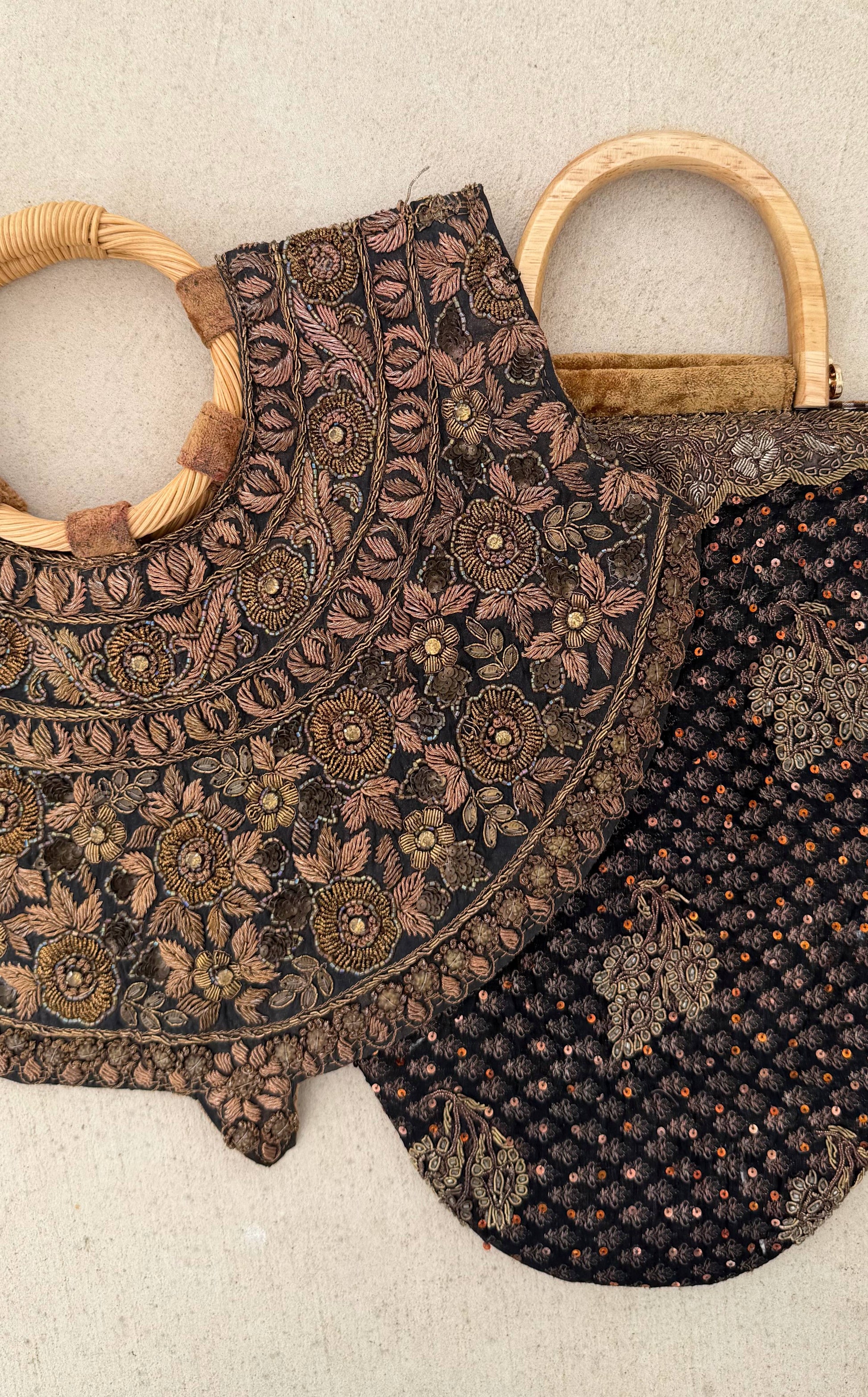 Bolso de pieza vintage bordada con asa de caña.