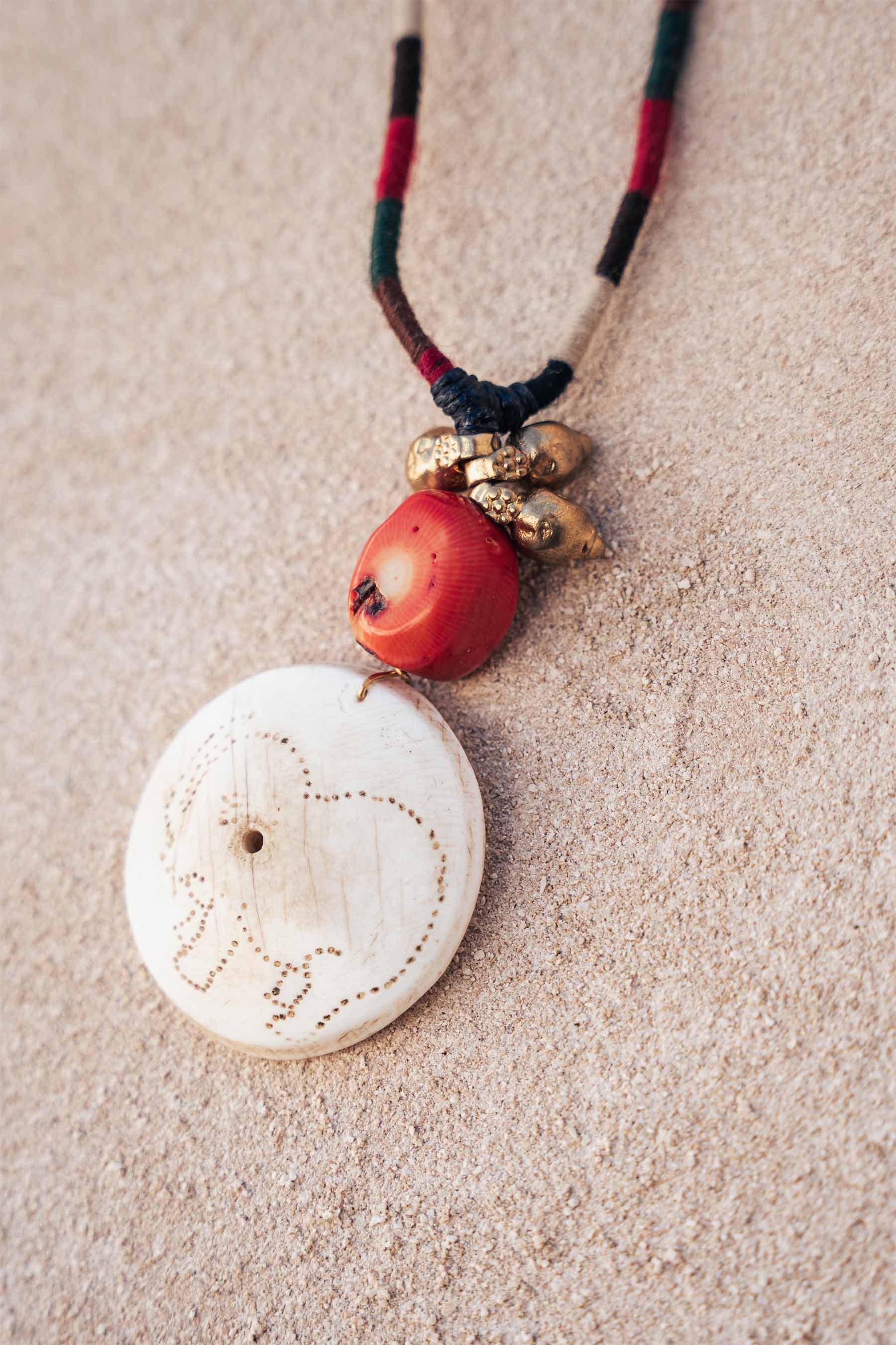 Collar cordón algodón con conchas antiguas, coral y piezas doradas.