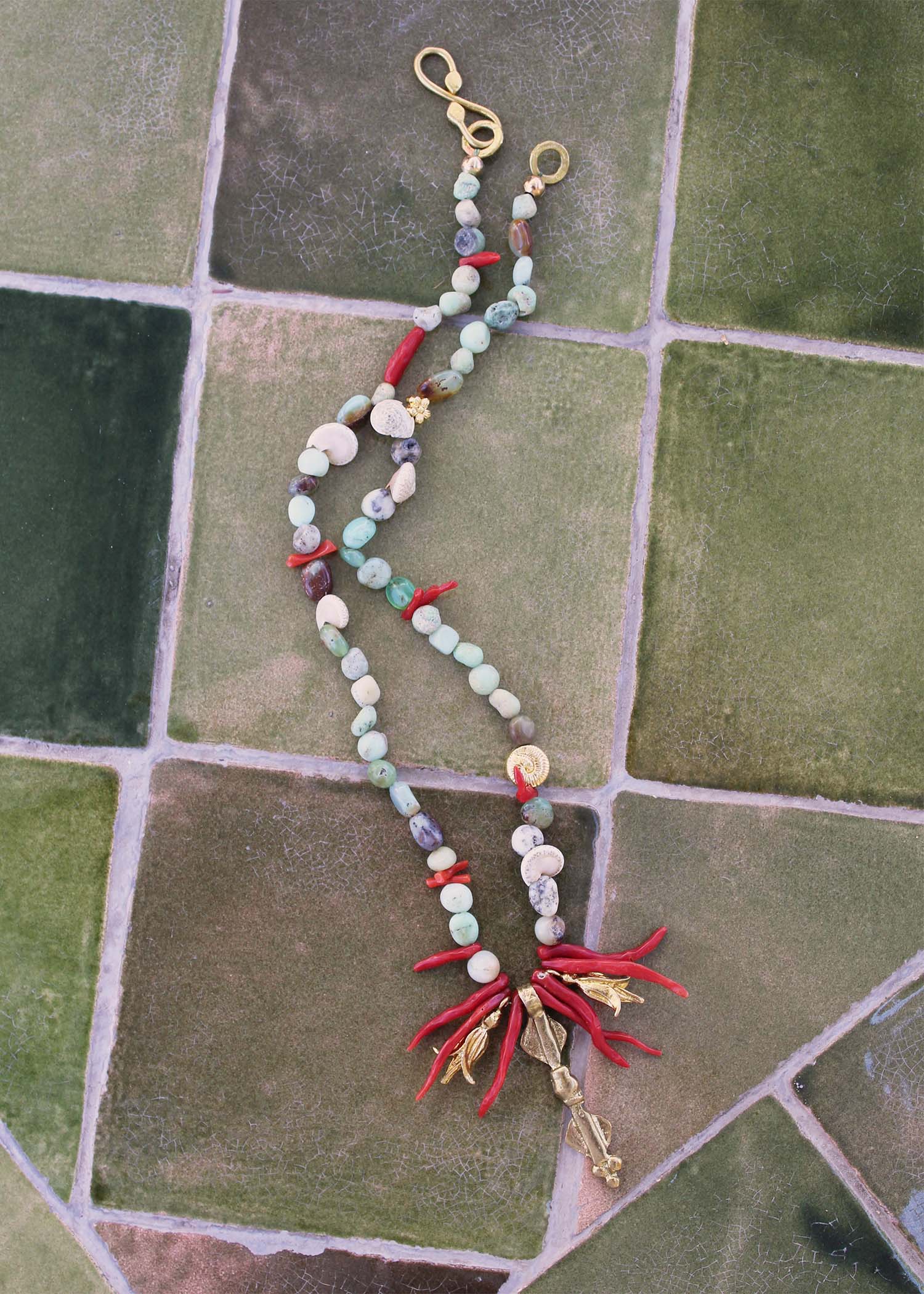 Collar piedras naturales, piezas latón con baño de oro y corales del mediterráneo.