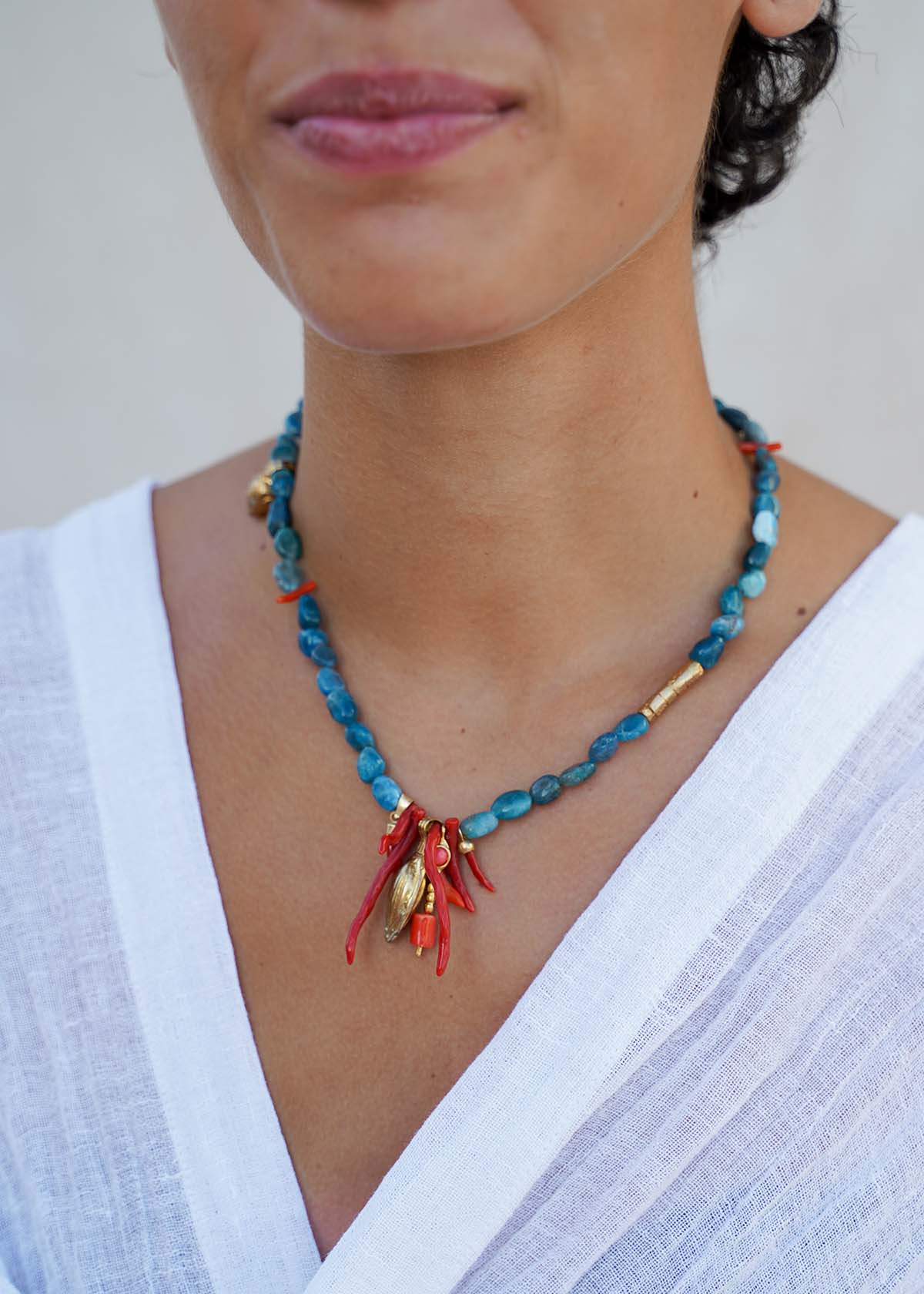 Collar piedras naturales, piezas latón con baño de oro y corales del mediterráneo.