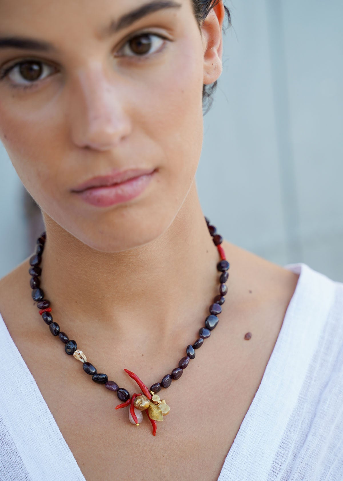 Collar piedras naturales, piezas latón con baño de oro y corales del mediterráneo.