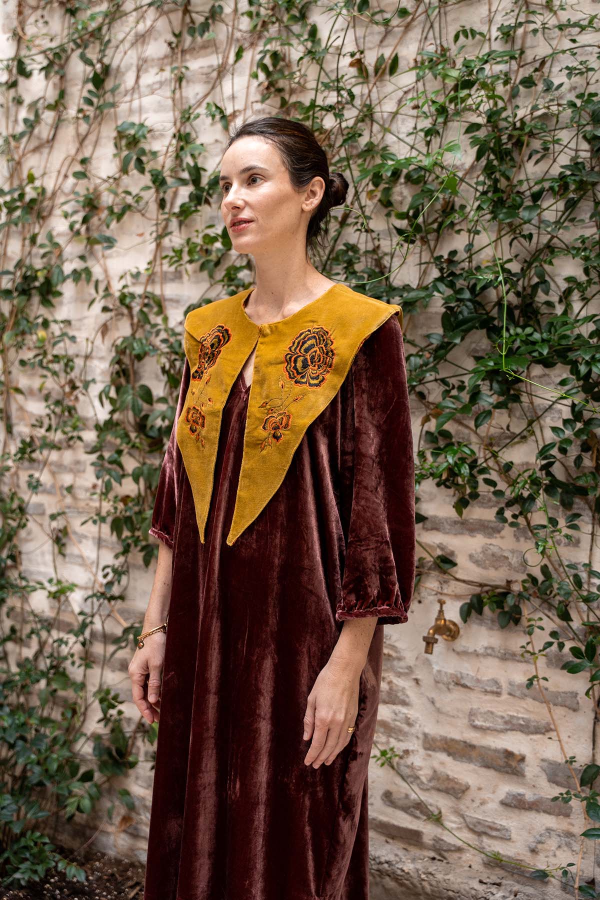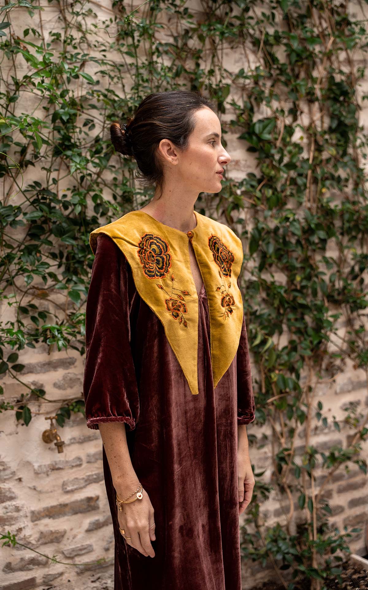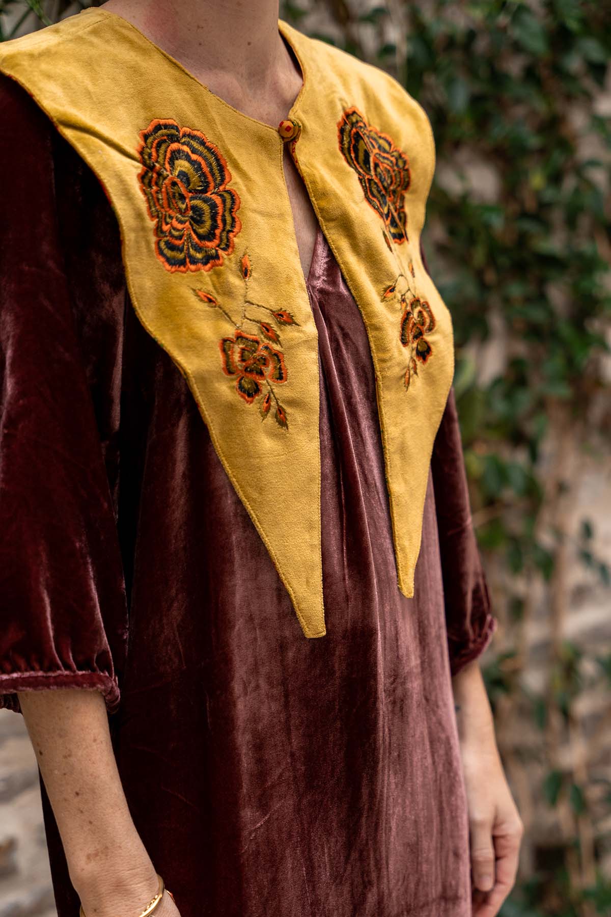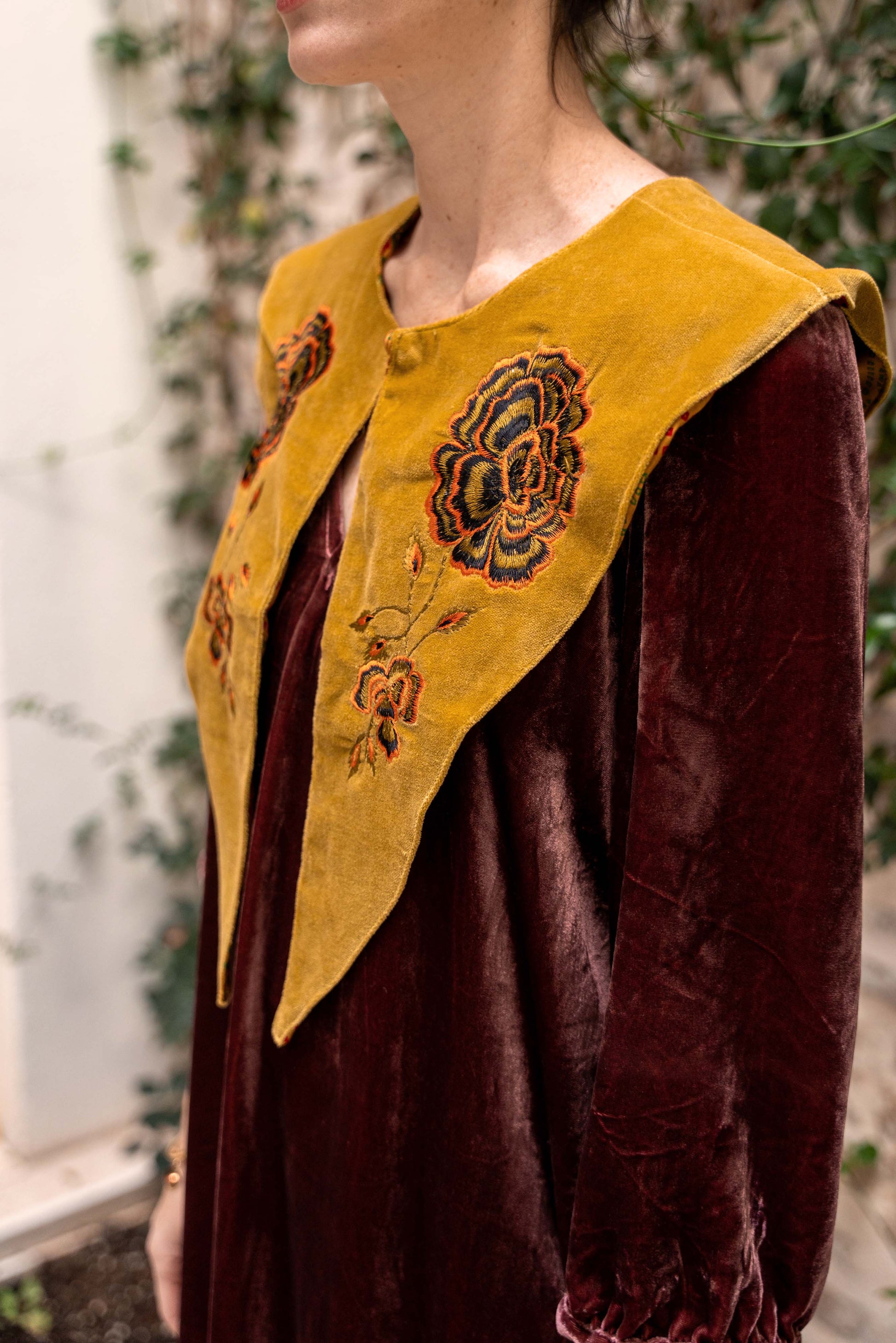 Cuello en terciopelo con flores bordadas con cierre con botón.