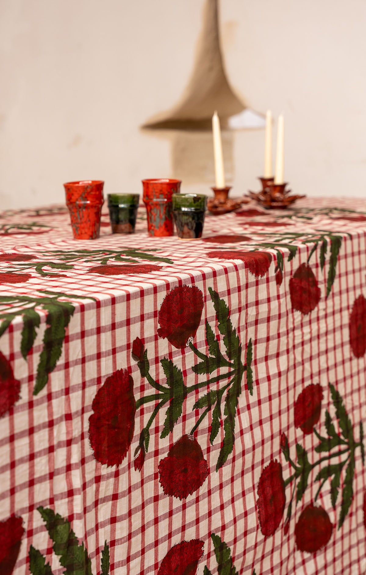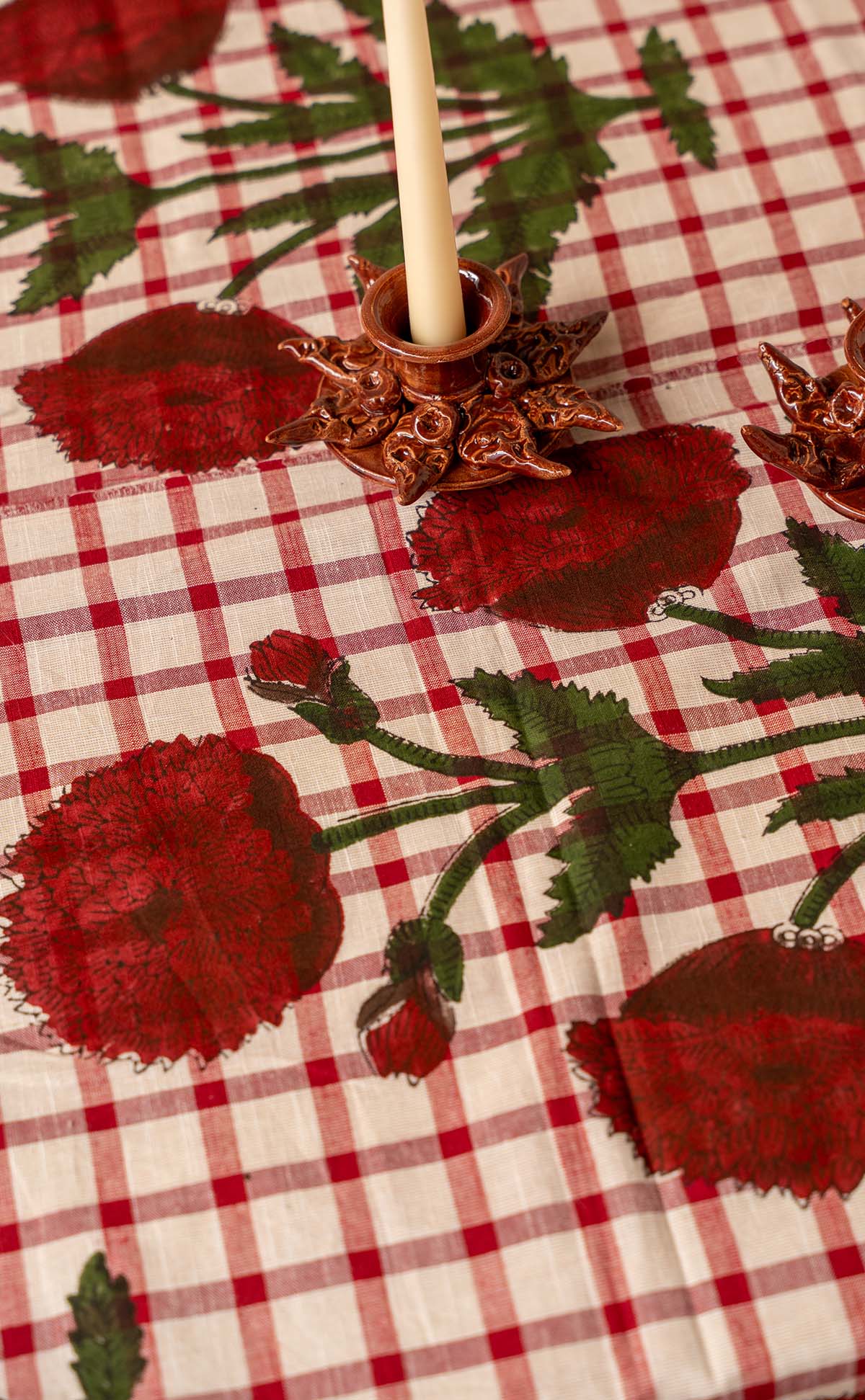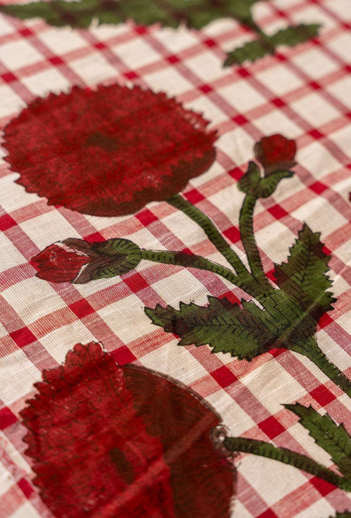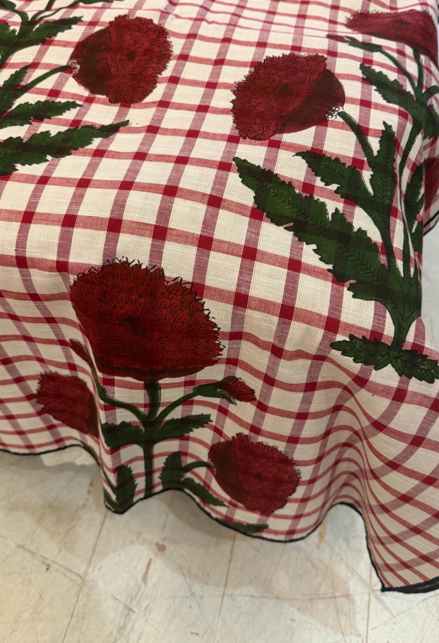 Mantel de algodón con block print y remallado en negro.