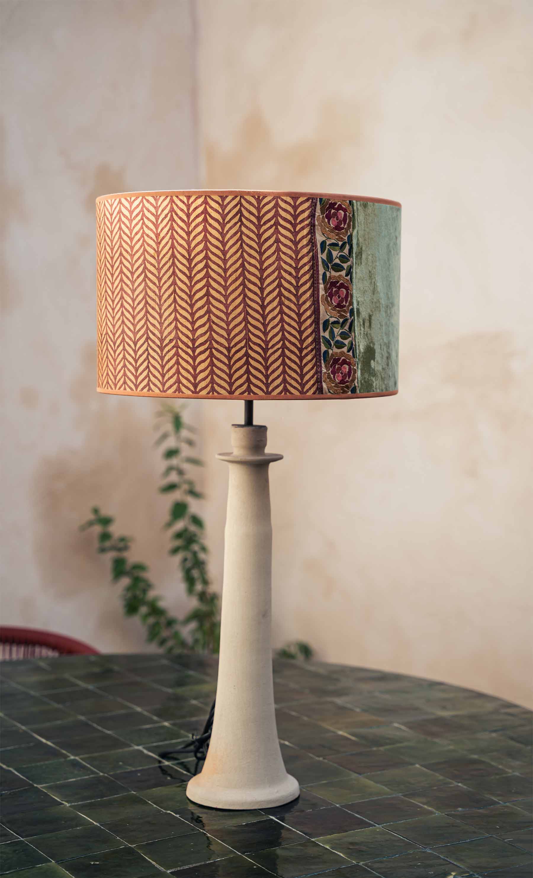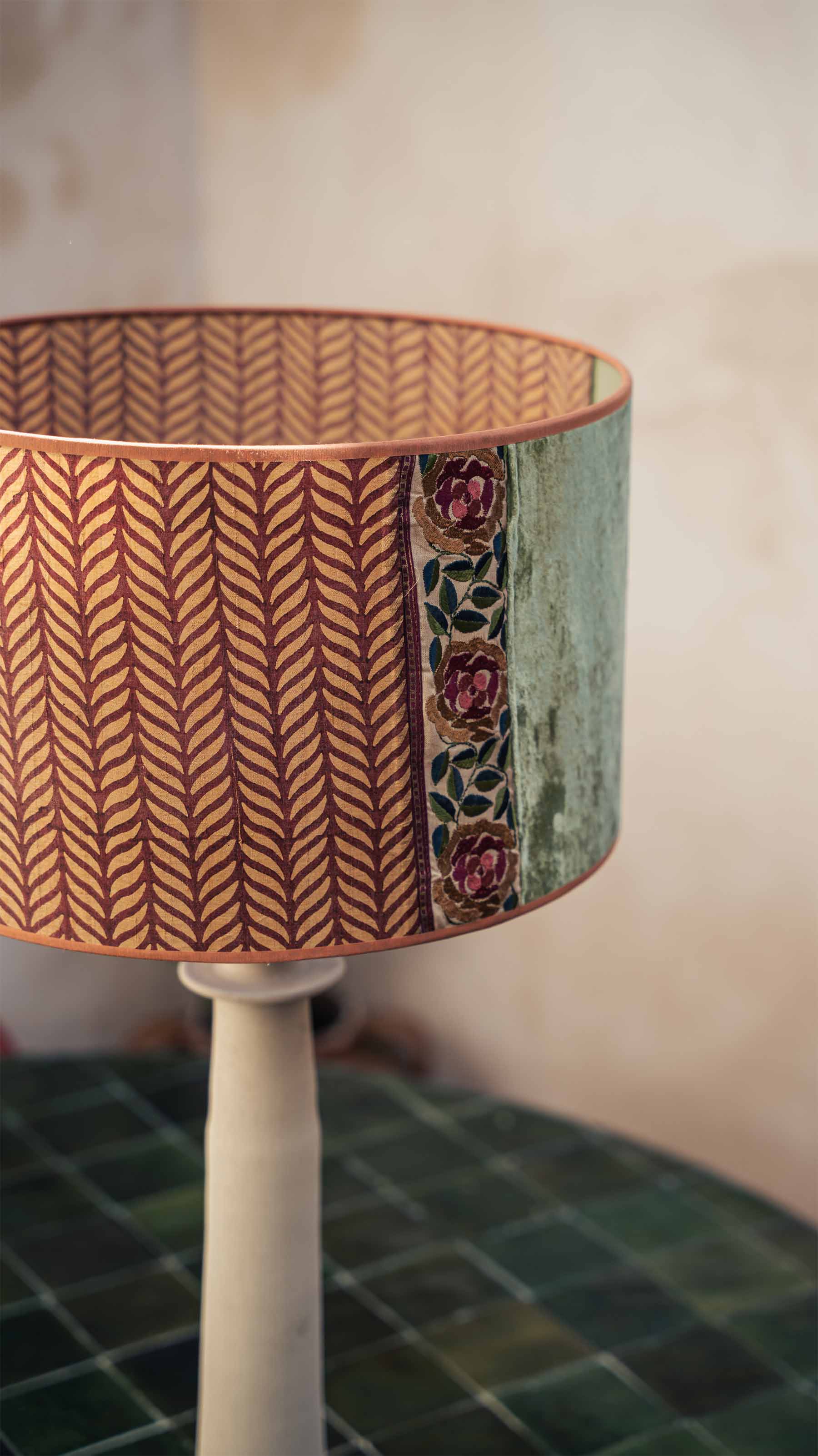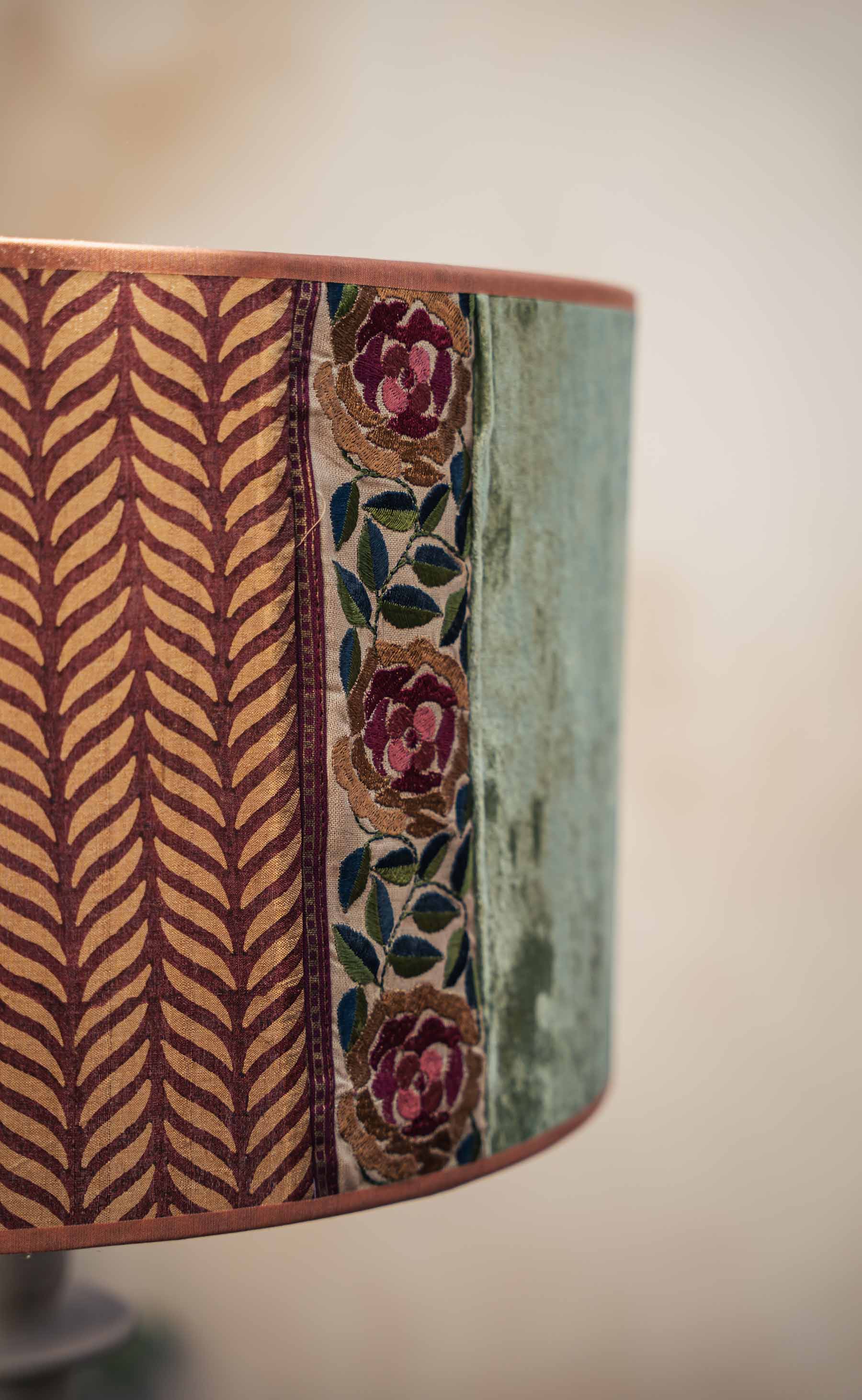 Pantalla cilíndrica realizada con seda, terciopelo de seda y cinta vintage bordada.