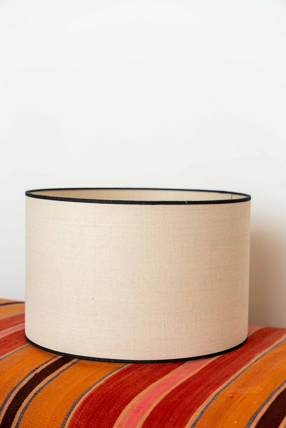 Pantalla cilíndrica en lino crudo con cinta negra.