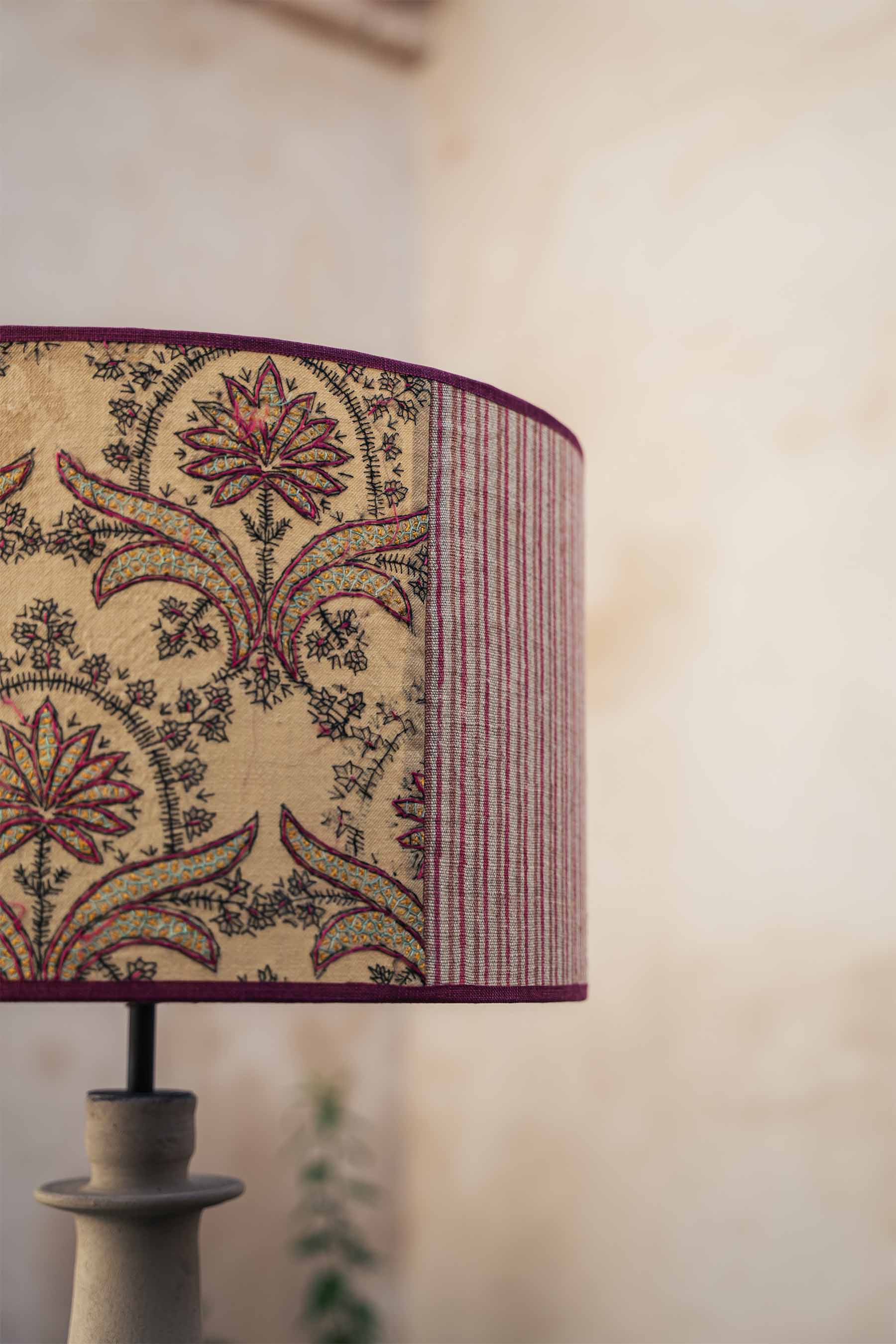 Pantalla cilíndrica de lino y pieza vintage bordada.