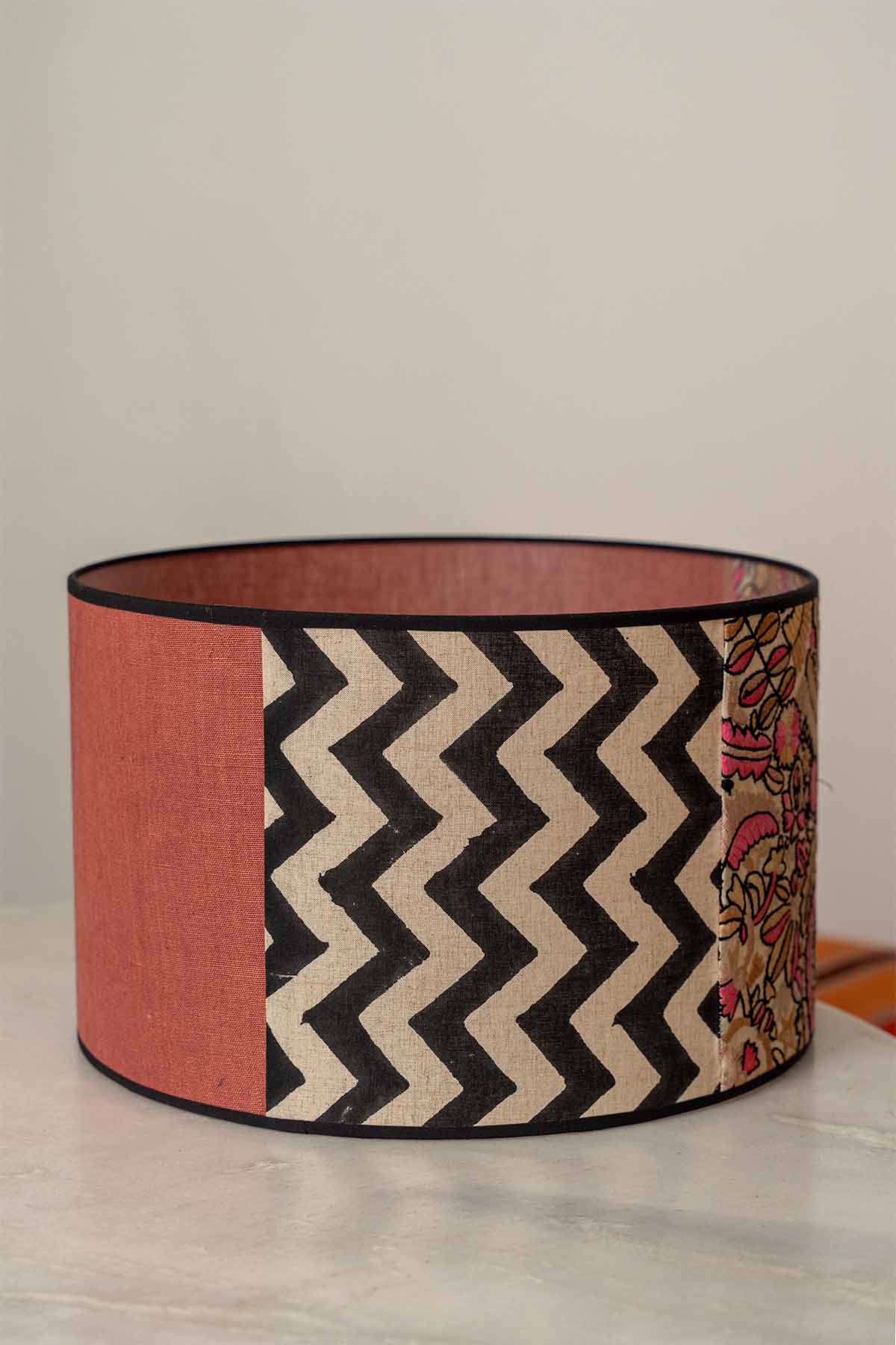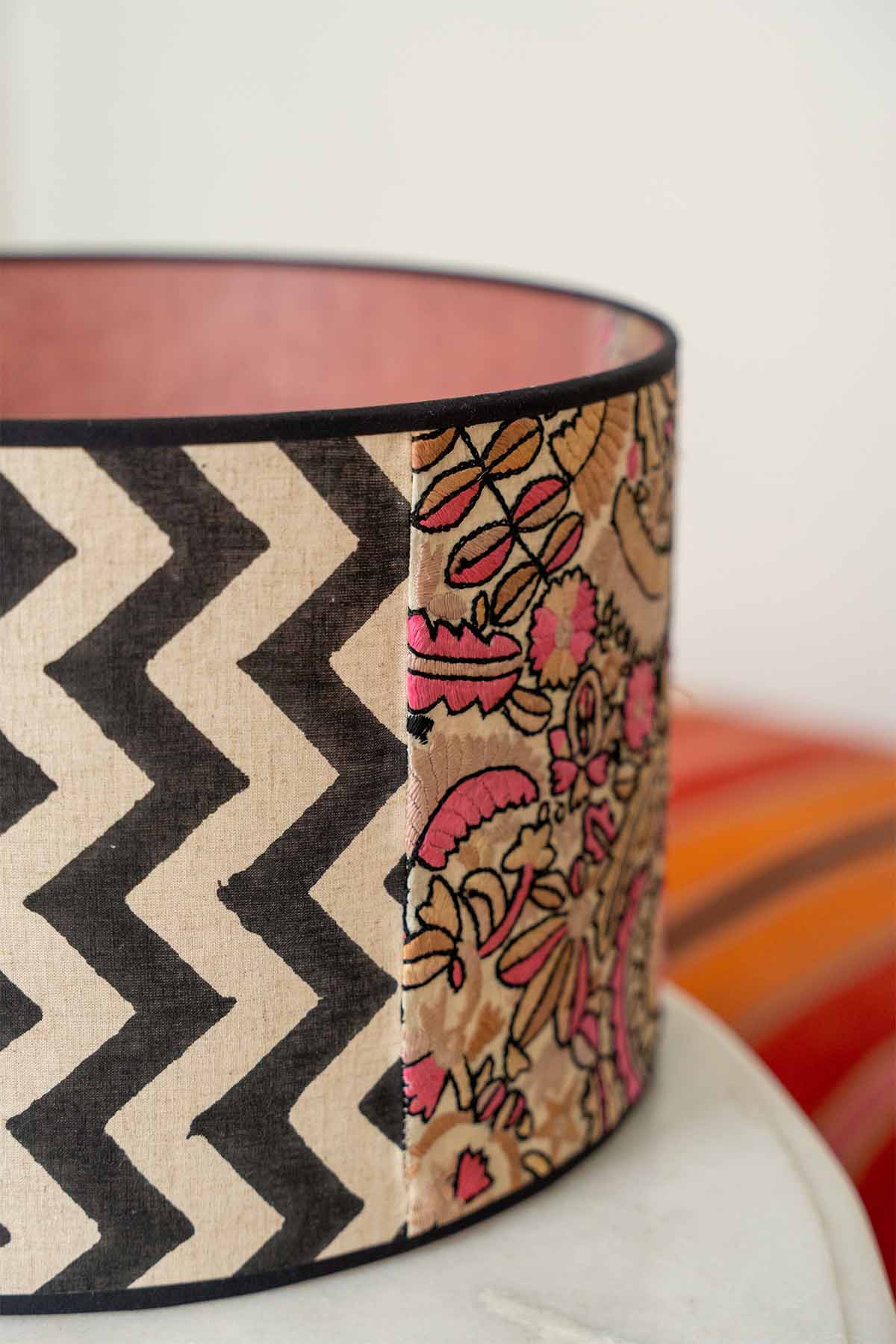 Pantalla cilíndrica de lino, algodón block print en zigzag y seda bordada.