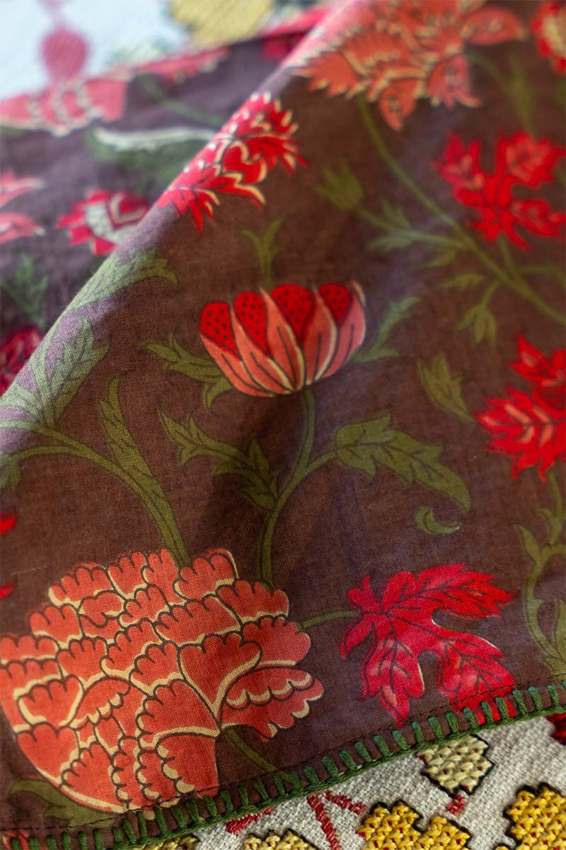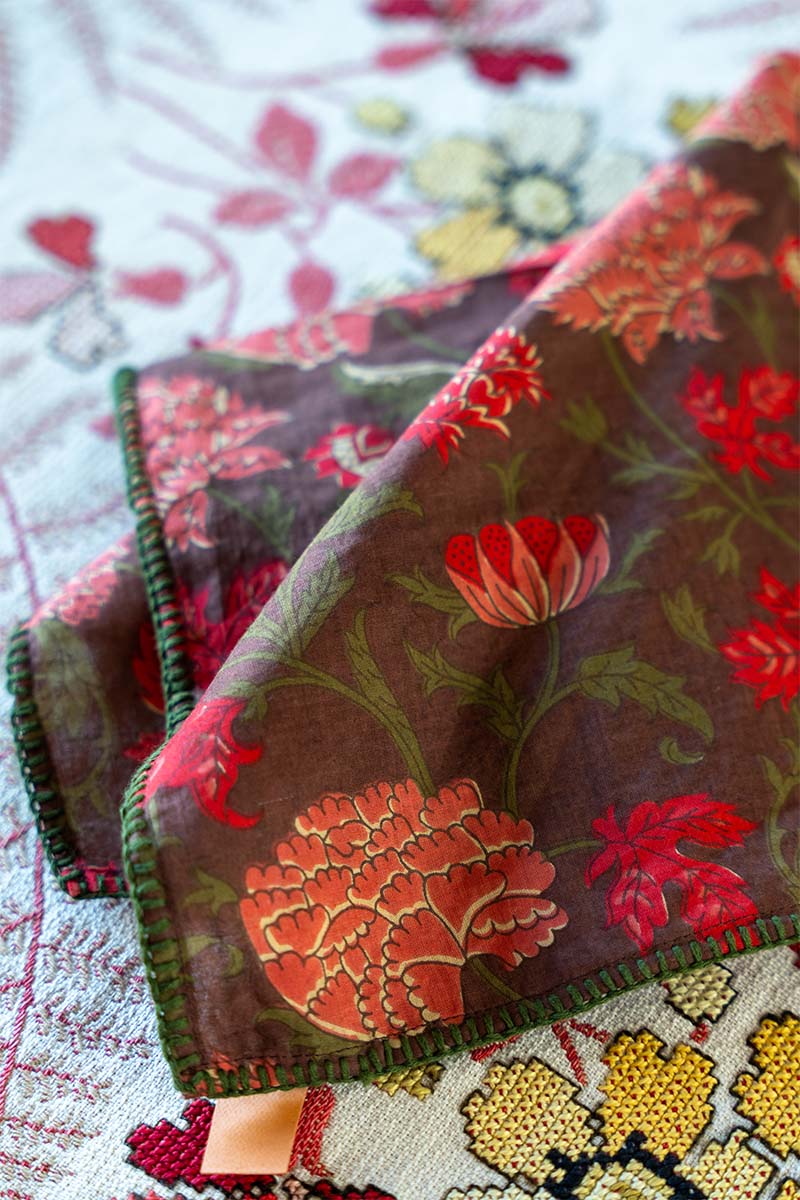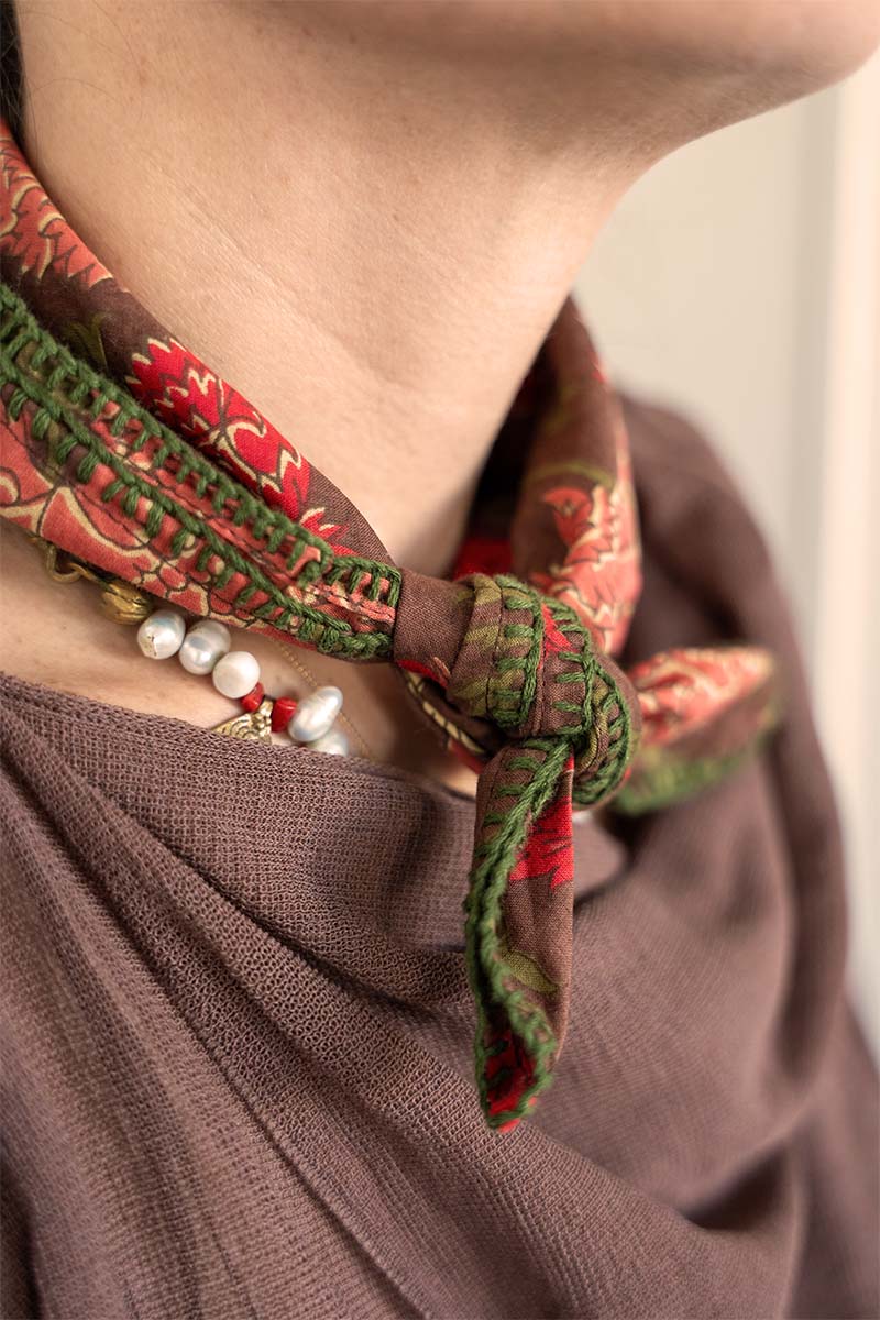 Pañuelo en algodón block print. Detalle de bordados a mano en color verde