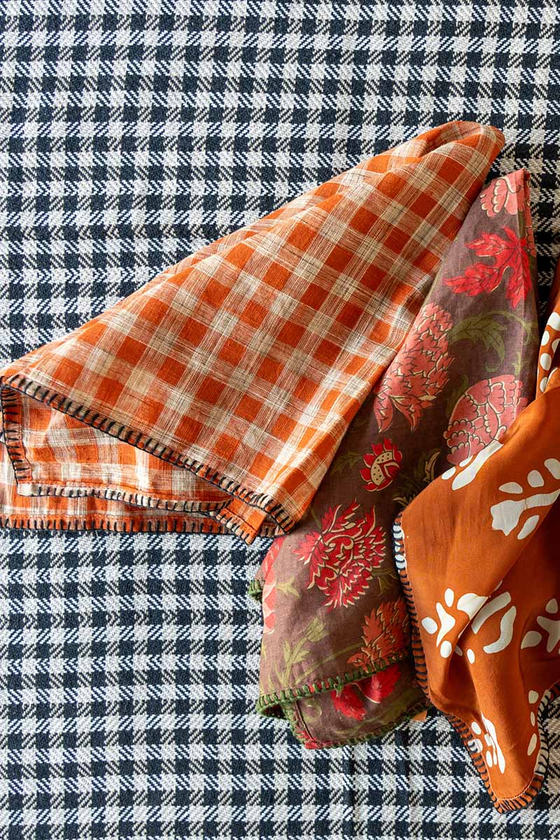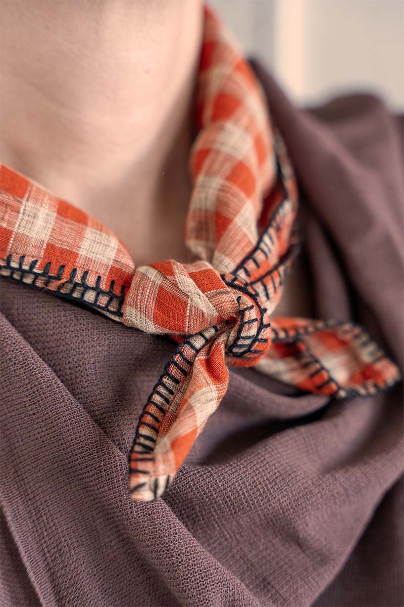 Pañuelo en algodón con cuadros. Detalle de bordados a mano en color negro.