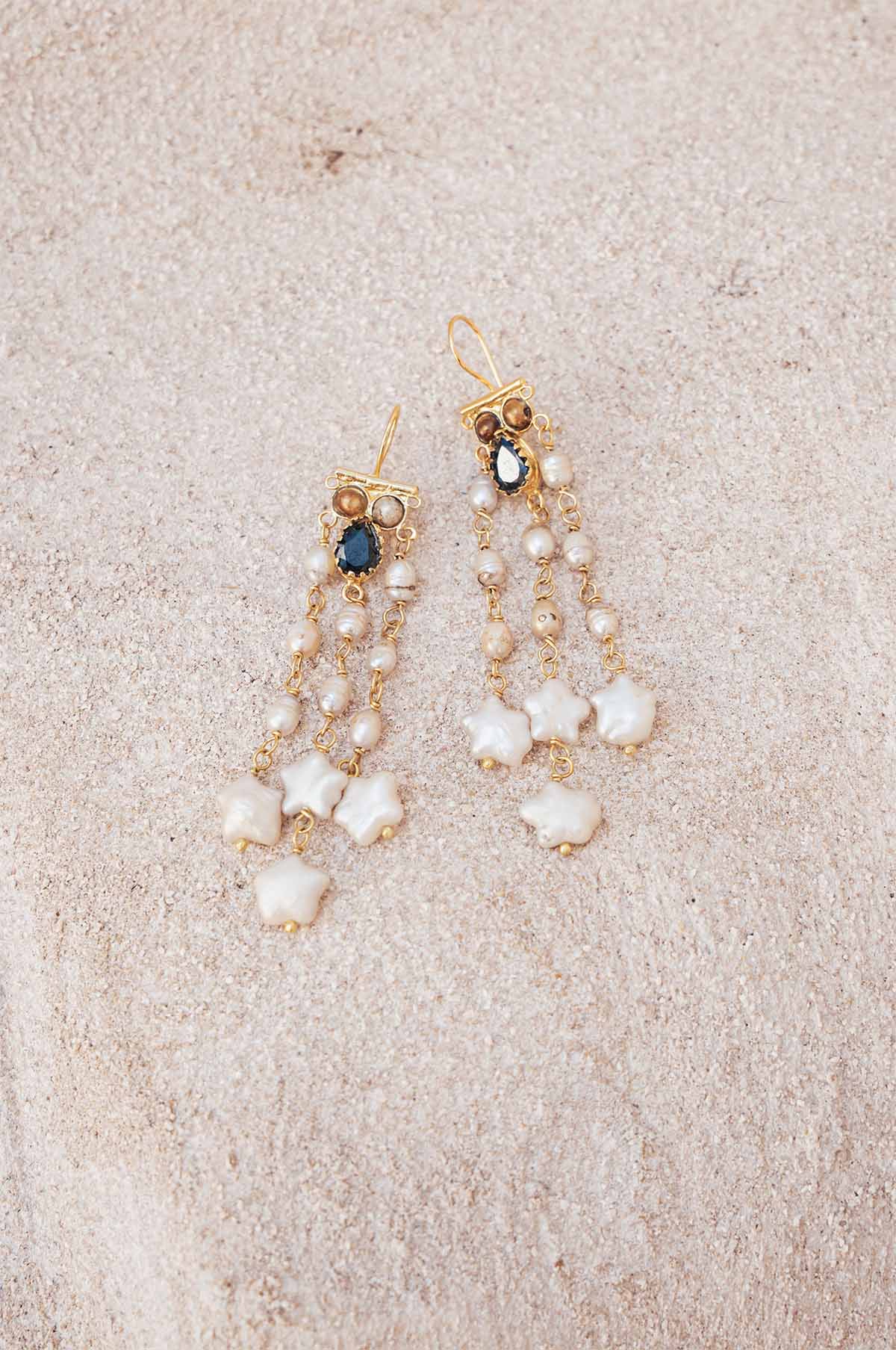 Pendientes de latón con baño de oro, amatistas, perlas y ónix.